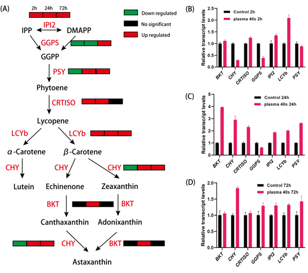 圖1. 放電等離子體作用引起蝦青素合成相關基因表達變化