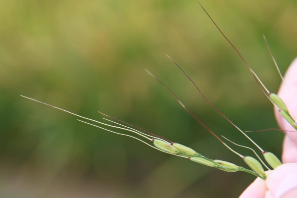 10月27日,在中科院合肥研究院智能所離子束生物工程與綠色農(nóng)業(yè)研究中心的育種基地里,副研究員葉亞峰介紹野生稻的稻芒。 新華社記者 張端 攝